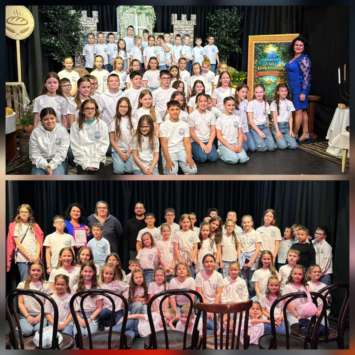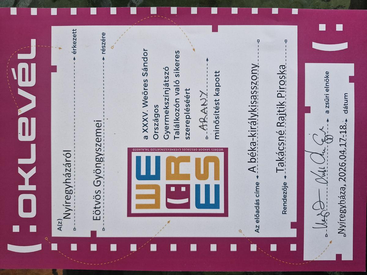 Az Eötvös Gyöngyszemei tehetséggondozó csoport 2024-ben alakult meg az Eötvös Gyakorlóiskola falai között. A csoport értékteremtő szándéka példaértékű, hiszen nemcsak a tehetségek kibontakoztatását szolgálja, hanem az Eötvös Gyakorlóiskola hírnevét is öregbíti országszerte. Munkájuk mögött elhivatottság, közösségi összefogás és a jövő generációjába vetett hit áll – mindez bízva az iskola vezetésének folyamatos támogatásában. Rendhagyó és egyedülálló módon 49 tanuló és egy szülő áll a színpadon, ami önmagában is jelképezi a közösség erejét és az együttműködés fontosságát. A csoport öt különböző évfolyamból tevődik össze, így valódi hidat képez a korosztályok között, erősítve az egymástól való tanulás és a közös alkotás élményét. Benedek Elek „A béka-királykisasszony” című csodálatos, szívbemarkoló történetét vitték színpadra. A darab az őszinte, tiszta szeretetről szól, és arról, hogy nem a külsőségek alapján kell megítélnünk egymást, hanem a belső tulajdonságok és a tettek mutatják meg igazán az ember jellemét. A csoport részt vett a XXXV. Weöres Sándor Országos Gyermekszínjátszó Találkozón és Fesztiválon Nyíregyházán, a Vásárhelyi László Alapfokú Művészeti Iskolában, ahol a Szabolcs-Szatmár-Bereg vármegyei fordulót rendezték. Ez a szereplés is jól mutatja a csoport szakmai felkészültségét és elkötelezettségét a minőségi színjátszás iránt. Az Eötvös Gyöngyszemei tehetséggondozó csoport ARANY MINŐSÍTÉST kapott. A zsűri javaslatára „A béka-királykisasszony” című színdarab továbbjutott a regionális fordulóra, amely óriási elismerést jelent a csoport számára. A következő megmérettetést Nádudvaron rendezik meg április 23-án.